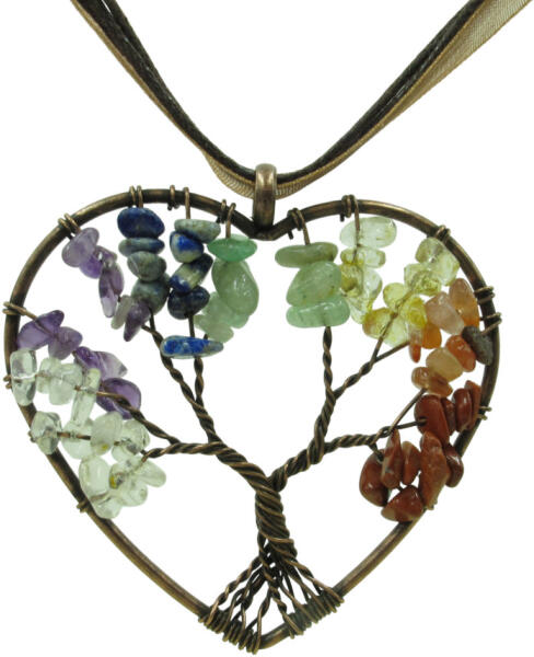 Egyedi drótos technikával készítettem szív alakú " ÉLETFA " medált, a csakrák működését segítő féldrágakövekkel, antikolt réz huzalba foglalva. Felhasznált ásványok: hegyikristály, ametiszt, lápisz, aventurin, citrin, karneol, jáspis